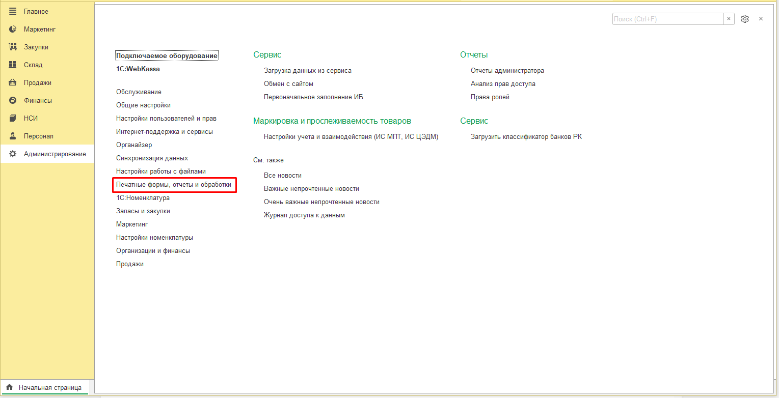 1. Откройте базу "1С:Розница для Казахстана", редакция 2.3" и перейдите в раздел "Администрирование". Зайдите в пункт "Печатные формы, отчеты и обработки".