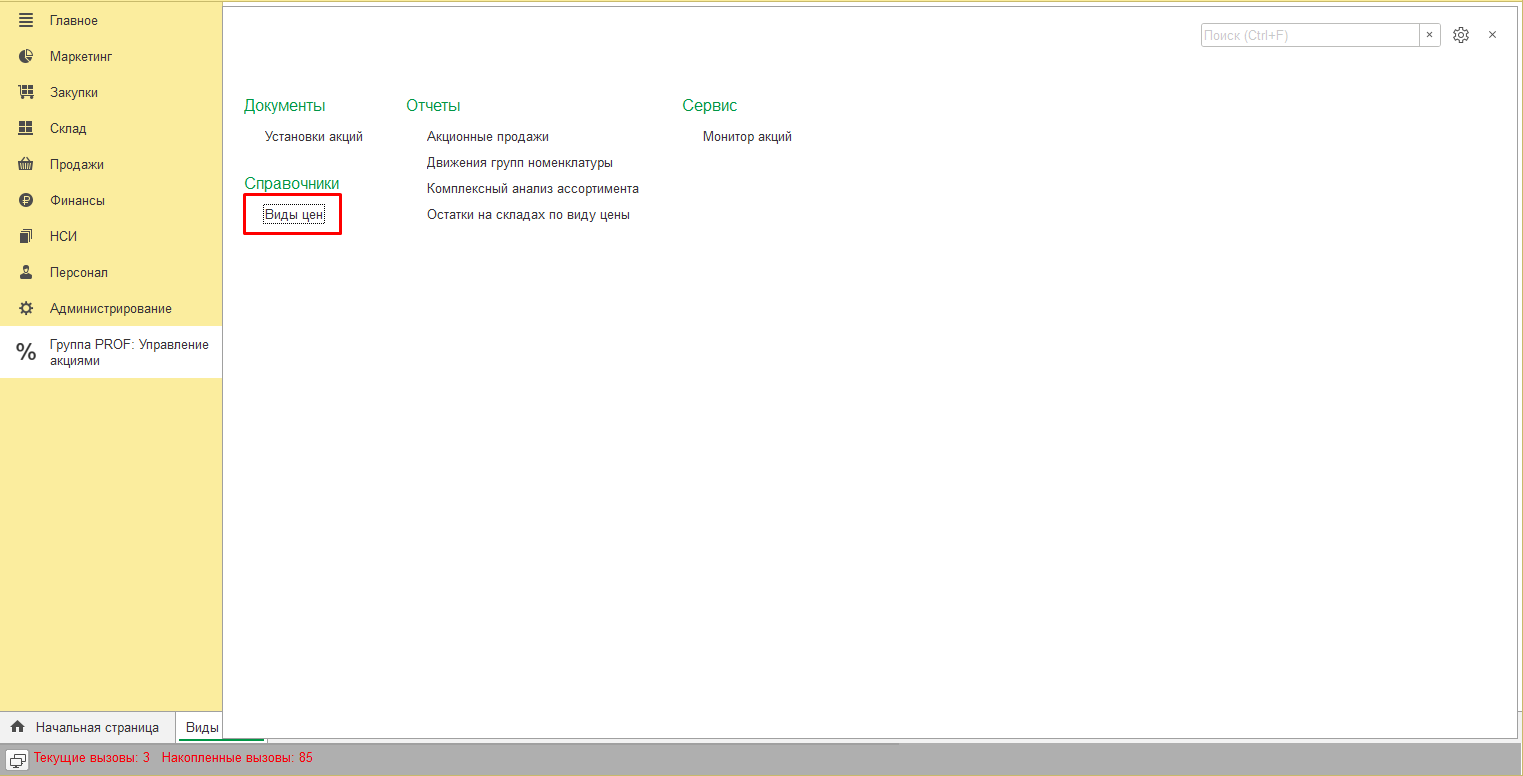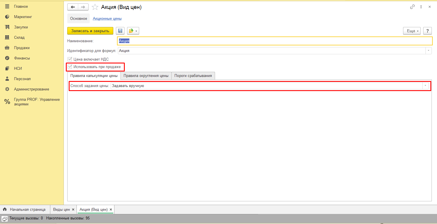 8. Перед началом работы с расширением необходимо создать вид цены "Акция" из раздела "Виды цен" основного раздела расширения